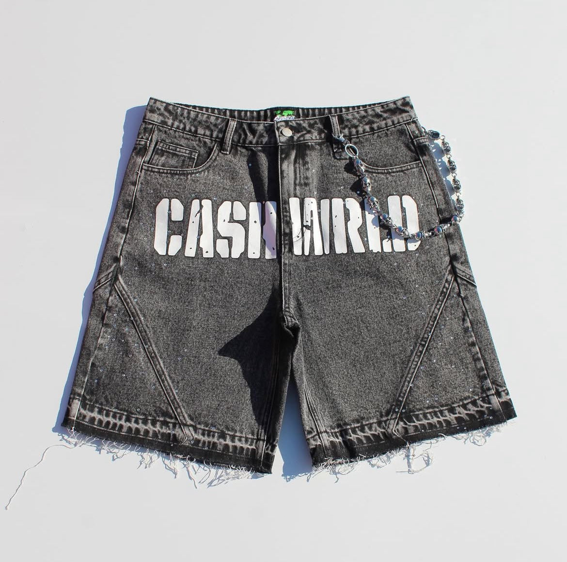 Camouflage shorts with 'CASH N'WRLD' text on a white background