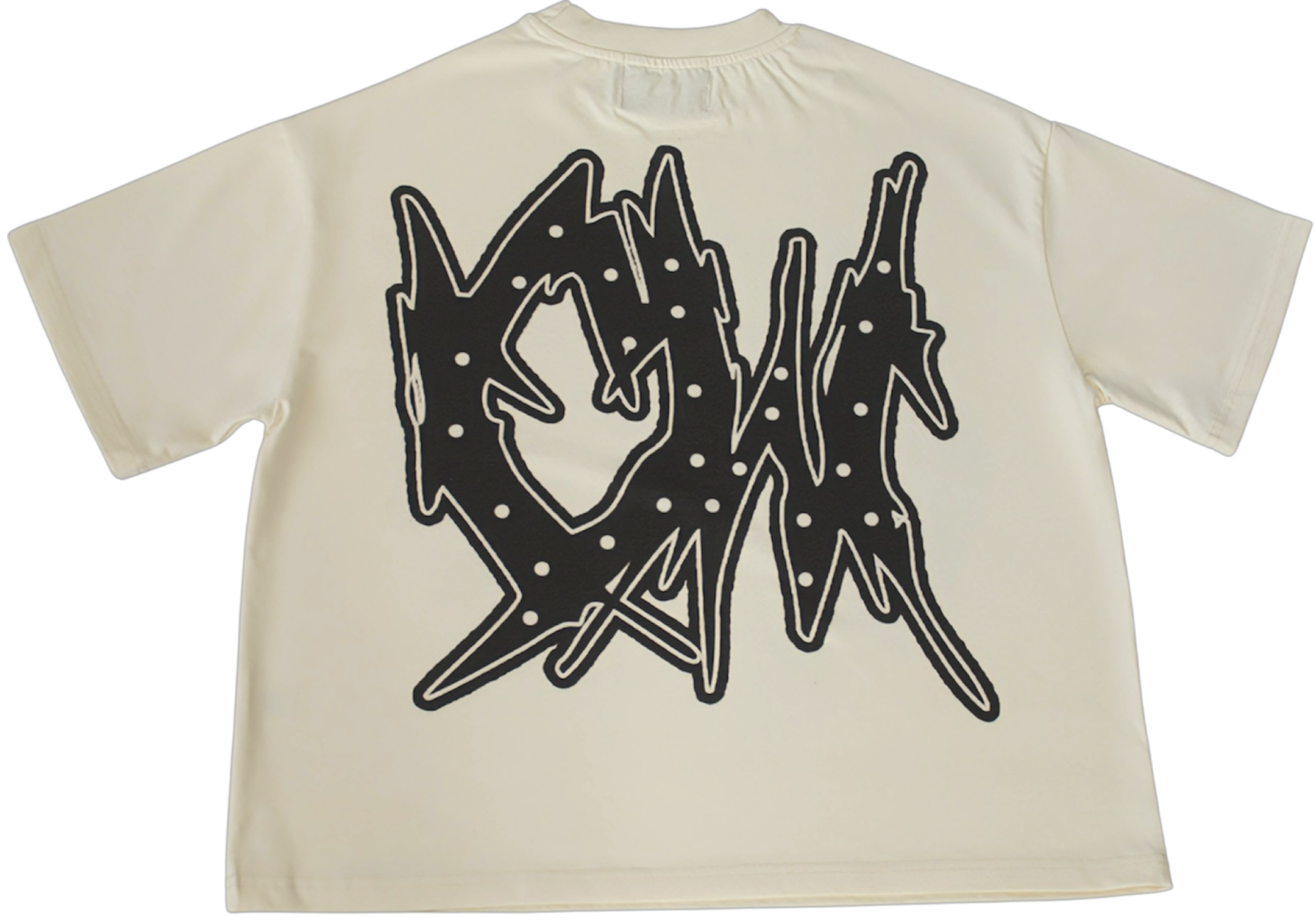 White t-shirt with a graphic design of a hand holding a heart on a white background
